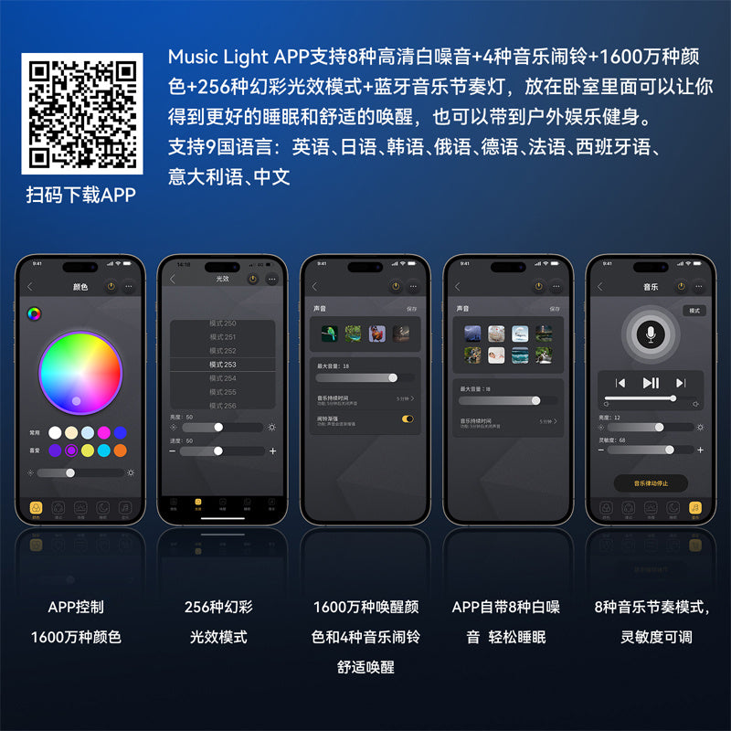 1. [256 COLOR RUNNING MODES] - There are 16 million colors and 256 kinds of color running modes on the Music Light app, you can scan the QR code on the user's manual to download the app.