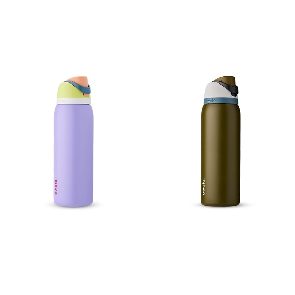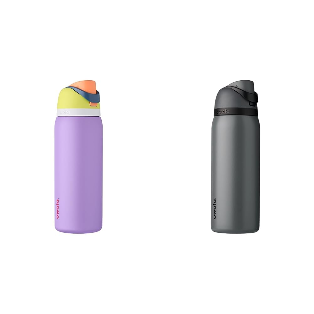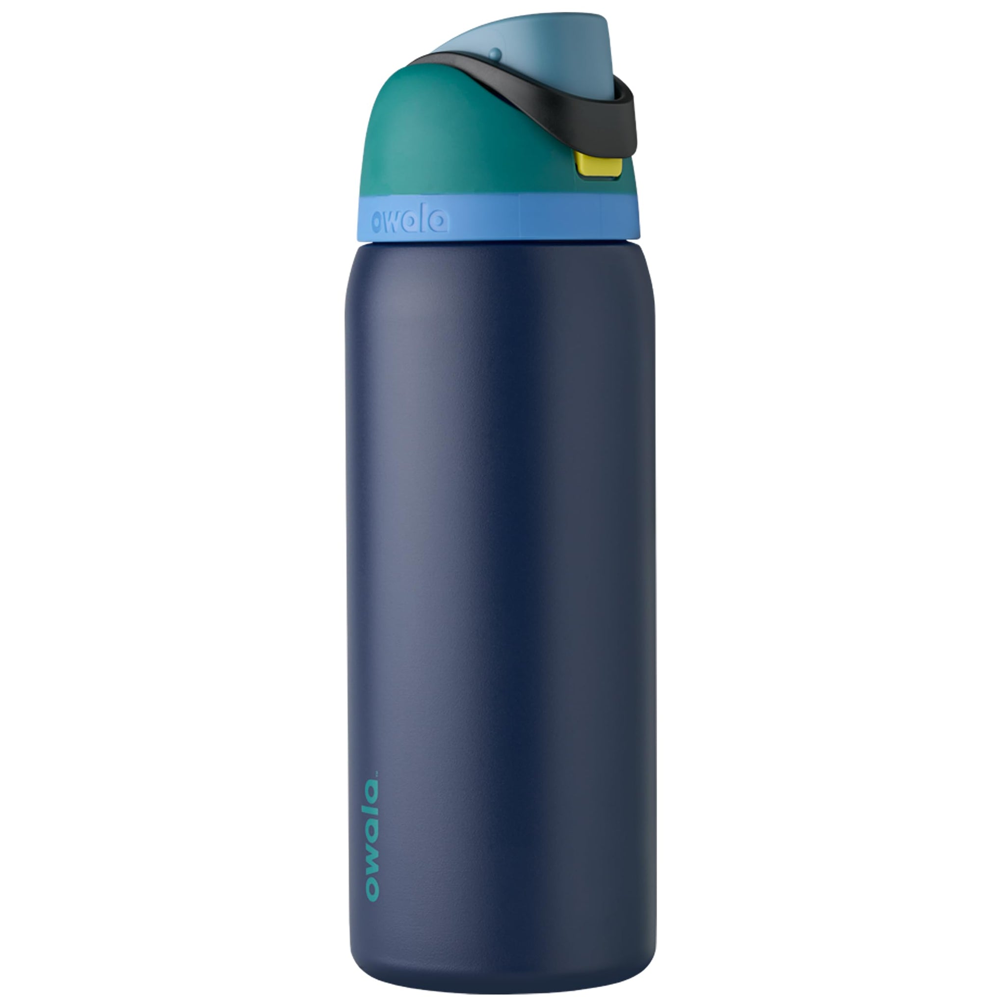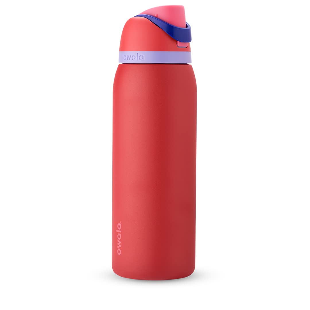 The Owala FreeSip Insulated Stainless-Steel Water Bottle with Locking Push-Button Lid easily tackles every thirst. With a built-in, easy-clean straw and a wide-mouth opening, the FreeSip reusable bottle is designed for drinking two different ways: sipping upright through the straw or tilting back to swig from the wide-mouth spout opening. Add in a push-to-open lid and playful colors, and staying hydrated has never been simpler—or more fun. Additional features include double-wall insulated stainless steel that keeps drinks cold up to 24 hours, a carry loop that doubles as a lock, a cup holder-friendly base, and a wide opening for easy cleaning and adding ice. The Owala FreeSip Insulated Stainless-Steel Water Bottle with Locking Push-Button Lid is available in three sizes: 24-Ounce, 32-Ounce, and 40-Ounce. Lid is dishwasher safe; hand wash cup. Not for use with hot liquids. Manufacturer’s limited lifetime warranty.