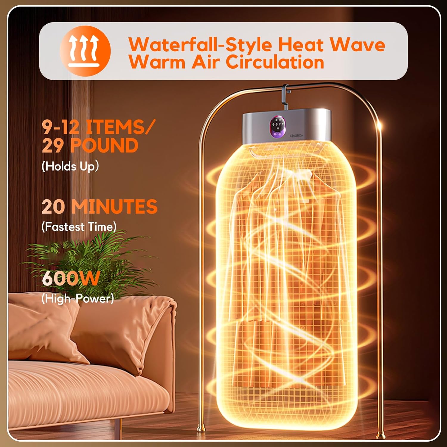 Portable Clothes Dryer With 3D Heat Circulation: CinGiiCo portable dryers for laundry can hold 9-12 items of clothing at a time. Dry clothes using a waterfall-style heat wave and warm air circulation. Dries a piece of clothing in as little as 20 minutes while preventing wrinkles