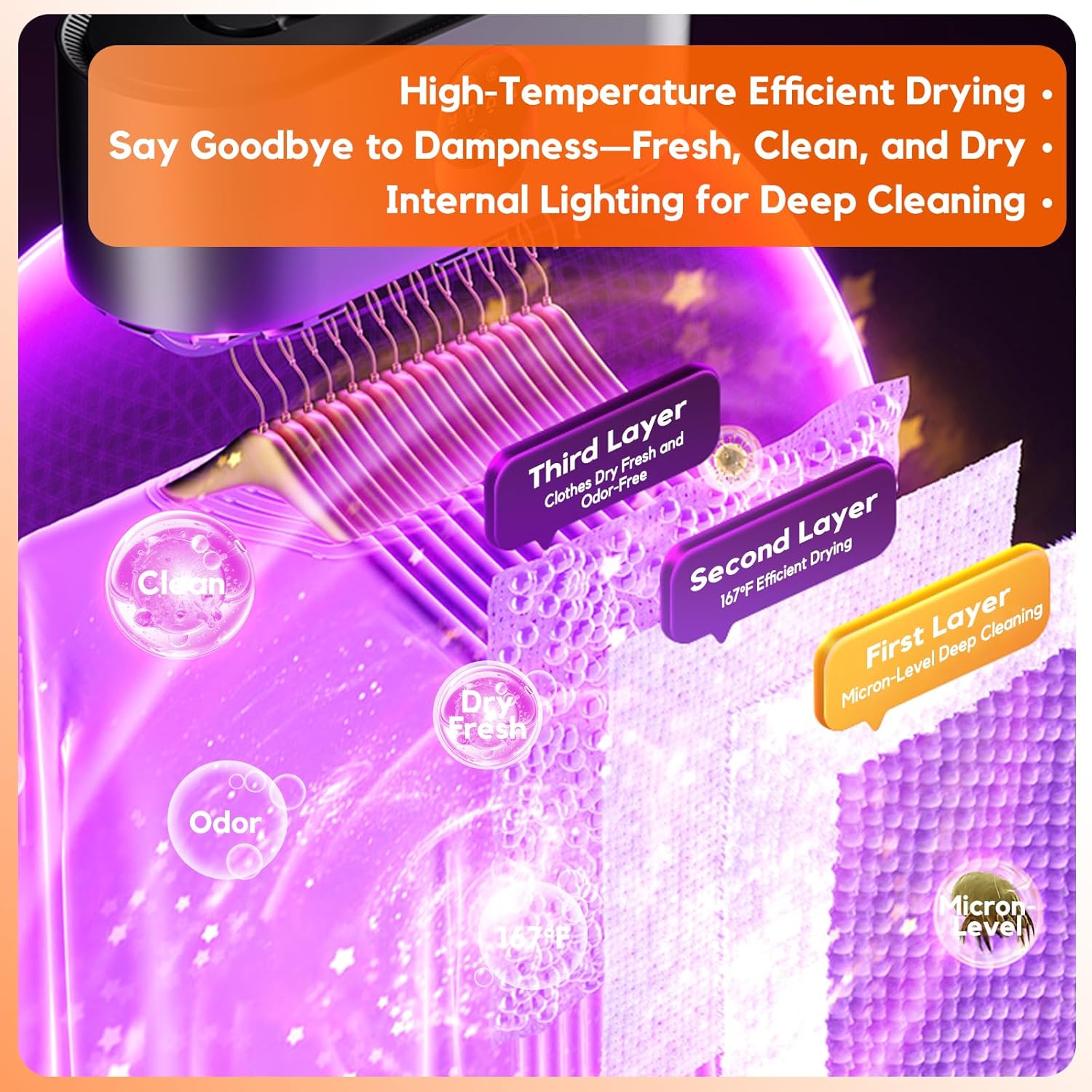 CinGiiCo Mini Dryer Time Setting: Automatic ironing machine supports four timer modes: 1 hour, 2 hours, 4 hours, and 8 hours. You can freely select the timing according to the type of clothing. The internal lighting of the product can achieve micron-level deep cleaning