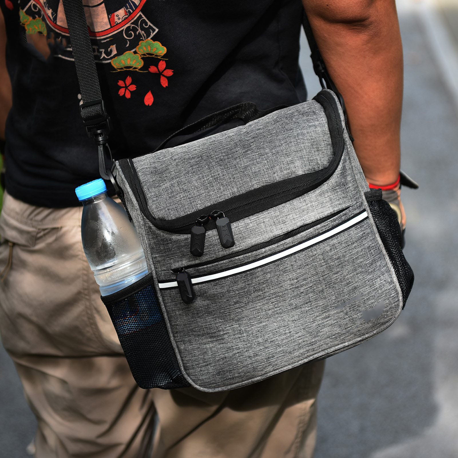 The Bike Triangle Bag is made with water-resistant polyester fabric to help keep your items dry. The spacious main pocket is made with thick padding and insulation to help keep your food/beverage warm or cold for hours. The front zip pocket and two mesh side pockets provide a convenient storage space for small items. With adjustable mounting straps, the bag is easy to install and remove. With the handle and shoulder strap, you can also carry the bag either in your hand or across your shoulder. Features: Made from high-quality polyester fabric, water-resistant and long lasting. Large main pocket with thick padding and insulation lining keeps food warm or beverage cold for hours. Zippered front pocket for easy access to your smartphone or other smaller items. Mesh side pockets for holding water bottle or umbrella. Reflective strips remain visible in low light for safer riding. Adjustable adhesive mounting straps for quick installation and release. Removable, adjustable shoulder strap allows you to carry the bag across shoulder. Specifications: Material: Polyester Color: Black / Grey (optional) Dimension: 25 * 9 * 26cm / 9.8 * 3.5 * 10.2in Weight: 288g / 10.1oz Package List: 1 * Bike Handlebar Bag